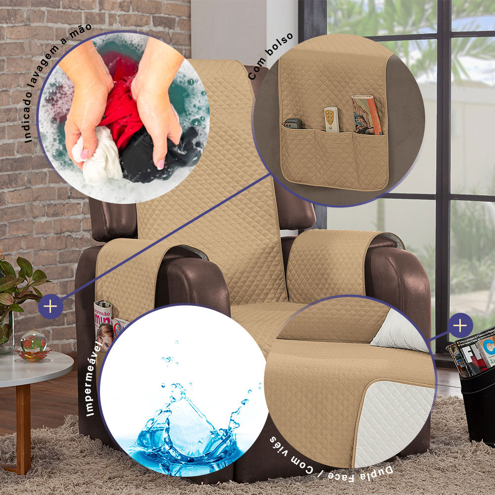 A capa de poltrona é cuidadosamente desenvolvida com um material interno que retém líquidos, prevenindo e reduzindo os impactos de possíveis acidentes no seu estofado. Sua versatilidade é evidenciada pelo design que permite o uso dos dois lados, cada um apresentando uma opção de cor distinta, permitindo que você renove o visual do seu ambiente conforme sua preferência.